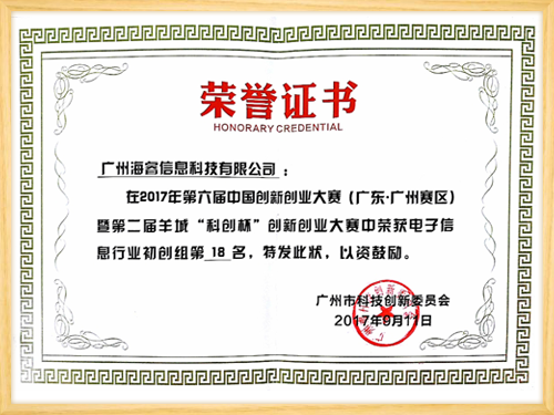 榮獲中國(guó)創(chuàng)新創(chuàng)業(yè)大賽廣州賽區(qū)優(yōu)勝獎(jiǎng)